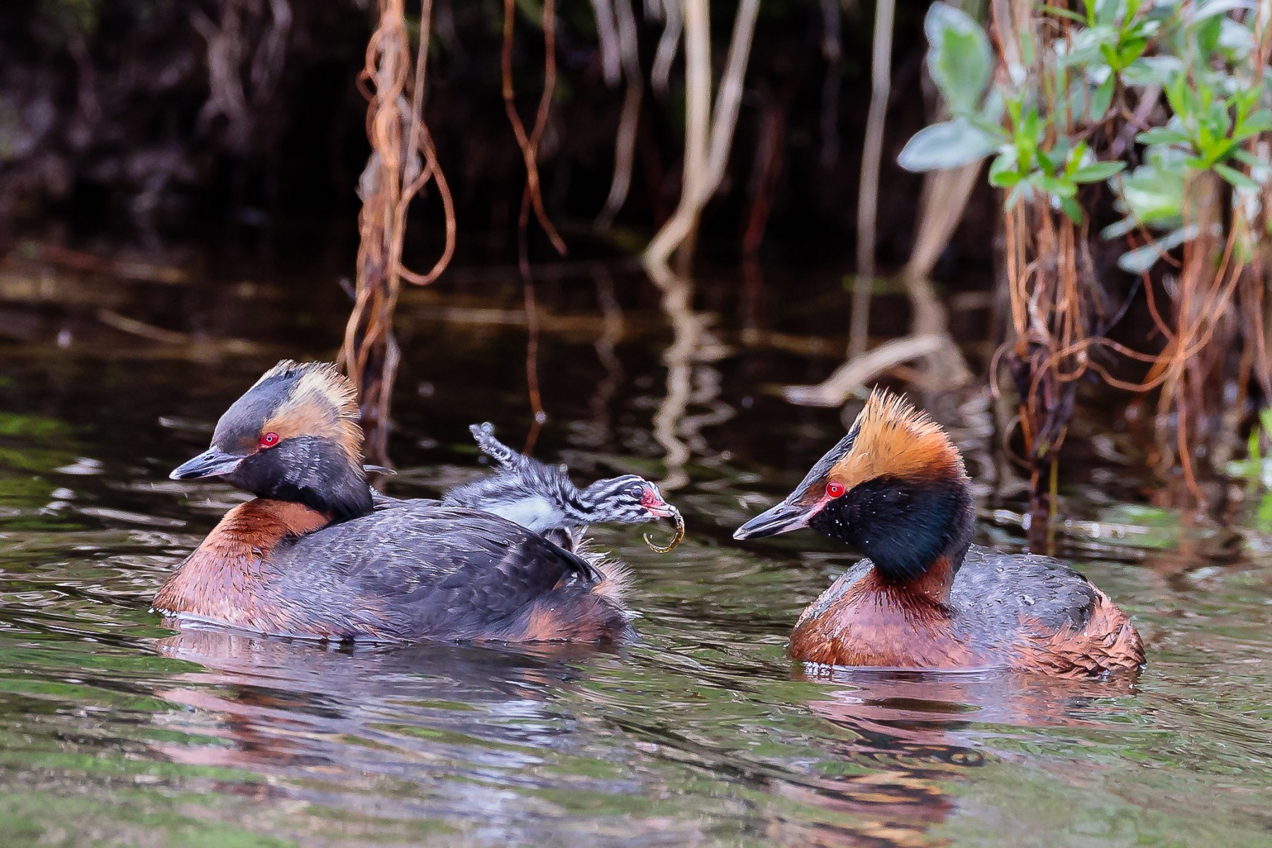 Sumir fuglanna eru á flugi, aðrir að sporðrenna fiski eða að gæða sér á gómsætri flugu. Flórgoðar eru í sérstöku uppáhaldi hjá mér á sumrin þegar þeir eru að dekra við litlu ungana sína.
