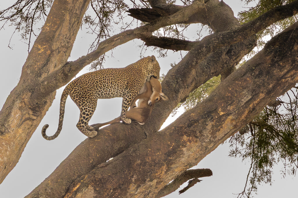 Við Hanna litla skruppum til Úganda í október og sáum meðal annars hlébarða veiða litla antílópu sér til matar. Við tókum fyrst eftir honum þegar hann var uppi á tré í þjóðgarði sem kenndur er við Murchison-fossana í Níl. Hlébarðinn var að fylgjast með antílópuhjörð og læddist niður tréð þegar hann hafði valið auðveldustu bráðina. Svangir hrægammar birtust fyrir ofan hlébarðann og bráðina. Nokkrar antílópur sneru við og fetuðu sig varlega í átt að stóra kattardýrinu, ef til vill í veikri von um að það sleppti litla greyinu. Hlébarðinn klifraði þá upp á nálægt tré með bráðina í kjaftinum og lagðist síðan kylliflatur upp á grein í skugga trjákrónu til að hvíla sig eftir erfiðið. Hann lá þar enn þegar við héldum áfram ævintýralegri ferð okkar um Perlu Afríku með góðum hópi ferðalanga á vegum Obeo Afríku.