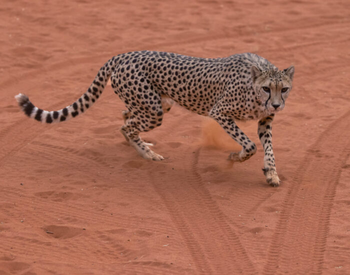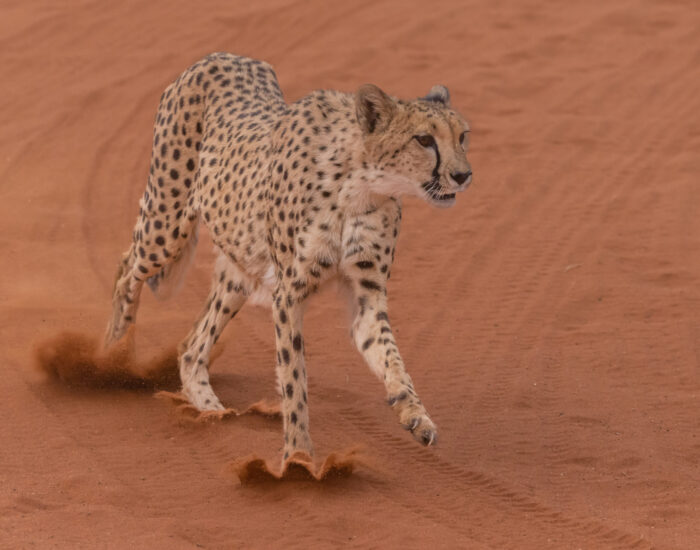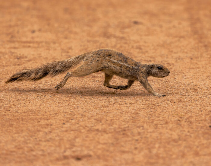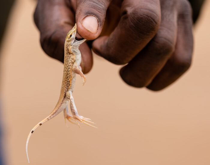 Við sáum líka eðlu (Meroles anchietae) sem kælir sig í steikjandi hitanum með því að dansa, þ.e. lyfta fótunum til skiptis upp úr sandinum. Þegar hitinn er svo mikill að dansinn dugir ekki kafar eðlan í sandinn. Hún er með flatt trýni sem gerir henni kleift að kafa djúpt niður í sandinn til að flýja hitann eða rándýr. Hún getur falið sig í sandinum í allt að sólarhring.