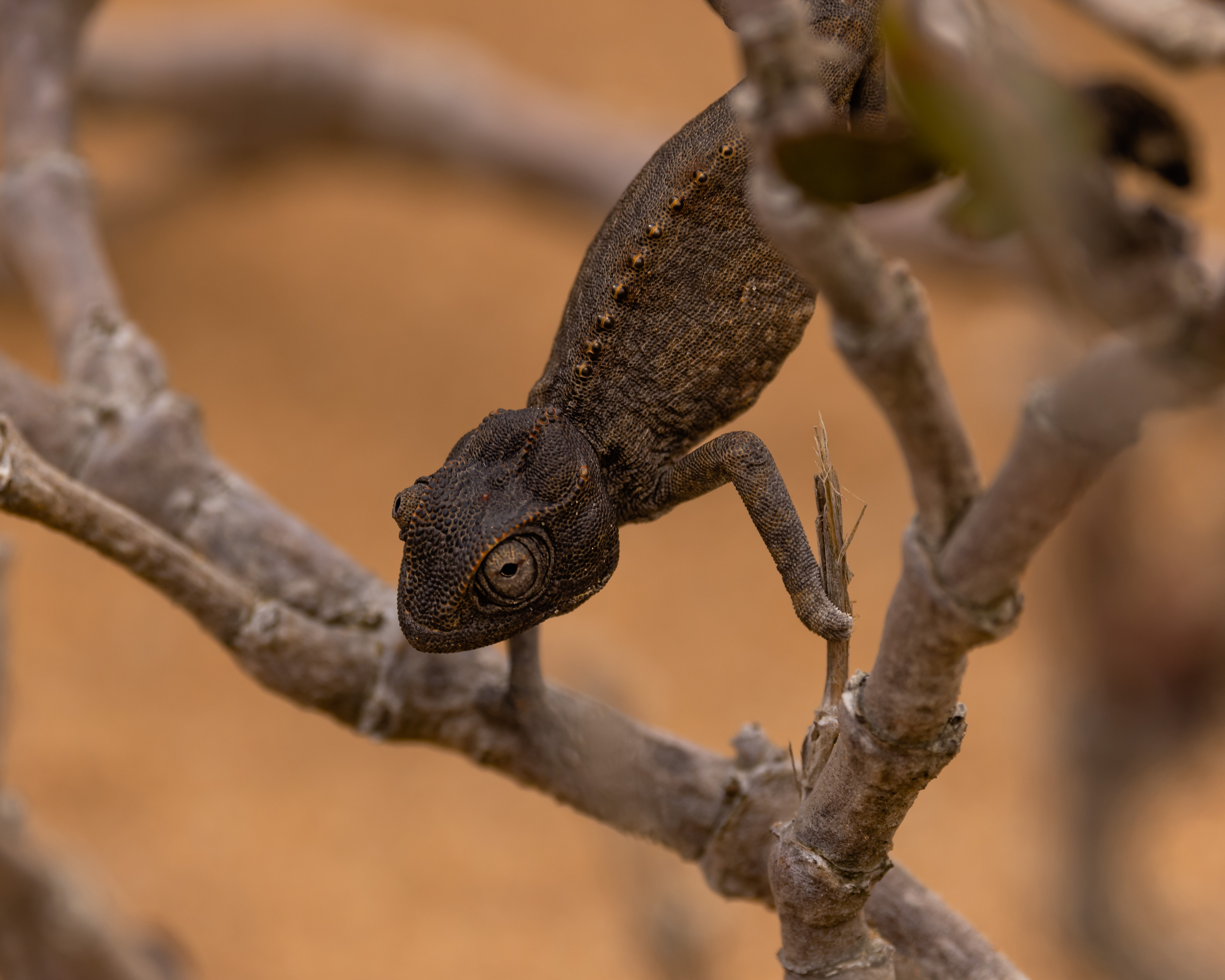 Namaqua-kameljón (Chamaeleo namaquensis) gladdi líka auga okkar. Litaskipti kameljónsins verða ekki vegna lita í umhverfinu eins og margir halda, heldur fyrir áhrif hita, birtu og geðbrigða. Namaqua-kameljónið er yfirleitt grátt eða brúnleitt, með ljósa flekki á síðunni en dökka á hryggnum og litirnir breytast eftir hita og birtu í umhverfinu. Hitabreytingarnar geta verið mjög miklar í eyðimörkinni, steikjandi hiti um miðjan daginn en kuldi á nóttunni og snemma á morgnana. Litaskiptin hjálpa kameljóninu að stilla hita líkamans. Það dökknar á morgnana þegar kalt er til að taka í sig varma en lýsist um miðjan daginn til að endurkasta sólarljósi og kæla sig.