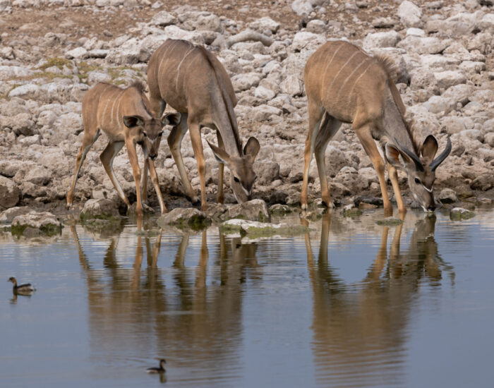 Kúdúantilópur (kálfur t.v., kvendýr og karldýr – Greater Kudu